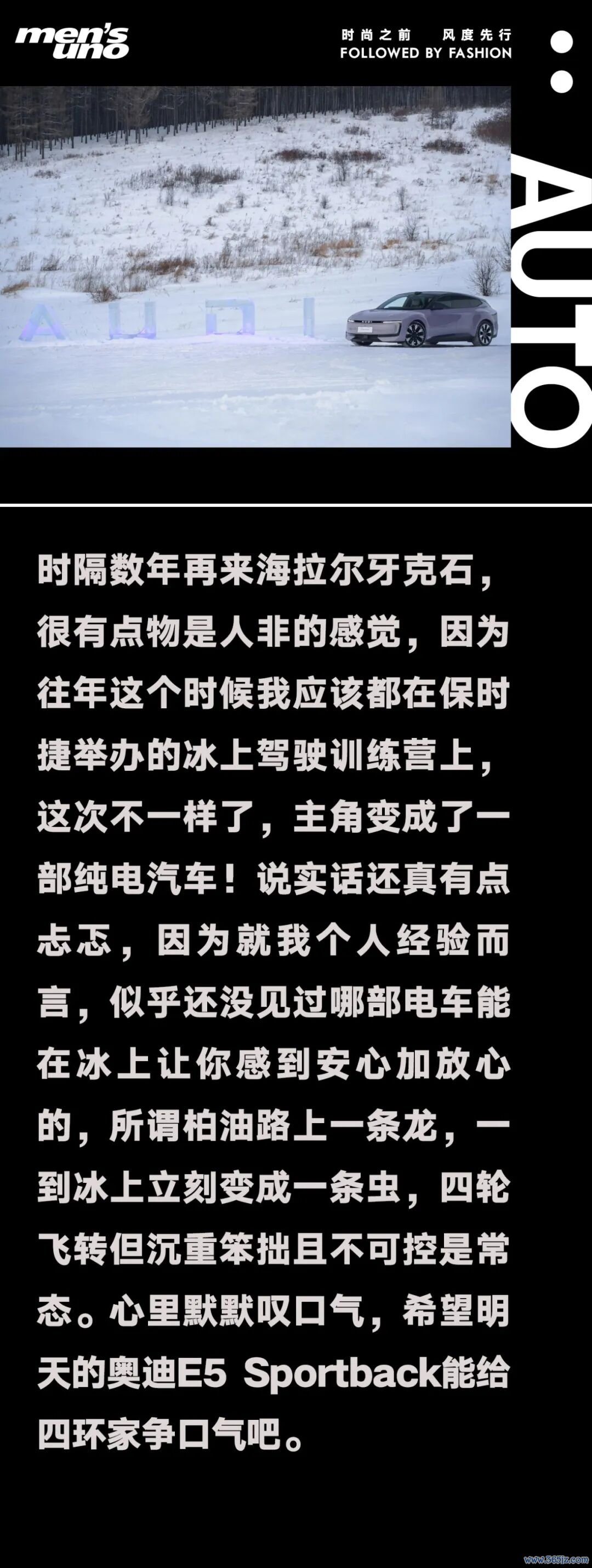 上了车,大“意外”来了。可是很负责的说,奥迪E5 Sportback在第一个弯角就征服了我。就我开的这部四驱版的奥迪E5 Sportback为例,比如你正处一个90度的左弯,向左轻打方向盘同时稳住电门踏板,感受到车尾开始向右漂了之后,反打方向盘等只等车身姿态摆正就可以冲向下一个弯角了。在一些组合弯,我还可以很容易的开出标准的钟摆运动来,也就是所谓的“斯堪尼亚式的过弯”。要知道毕竟几年没在冰上体验激烈驾驶了粤友钱,哪怕是来辆油车都是熟悉回忆一下才能找到感觉,而奥迪E5 Sportback就属于那种一个弯角就让你立刻上手那种,轻快、迅捷毫不拖泥带水,仿佛你体内的“冰雪小宇宙”被瞬间唤醒,就很神奇,而且它还是辆电车!