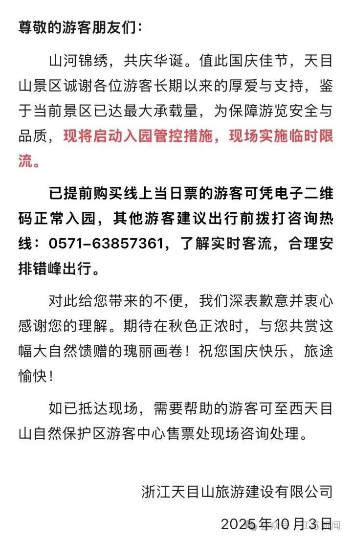 而10月3日,一则《关于10月3日天目山景区游客限流公告》在临安人的朋友圈炸了锅,许多当地人表示活了那么久,第一次看到天目山限流!