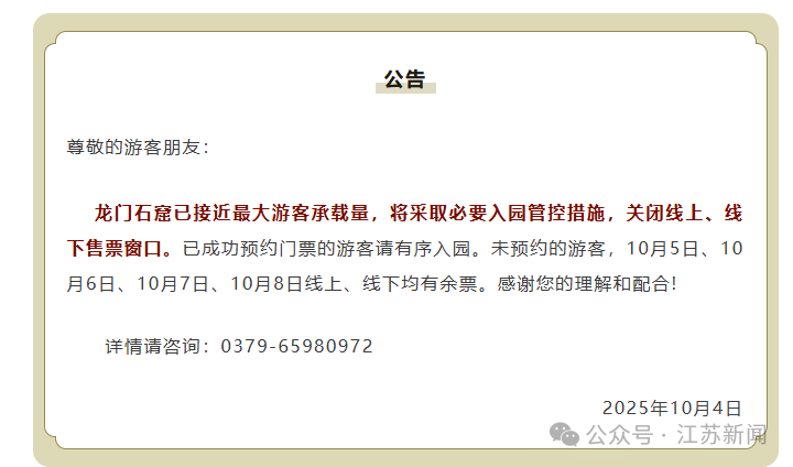 10月4日驰盈策略,洛阳龙门石窟官微公告:龙门石窟已接近最大游客承载量,将采取必要入园管控措施,关闭线上、线下售票窗口。