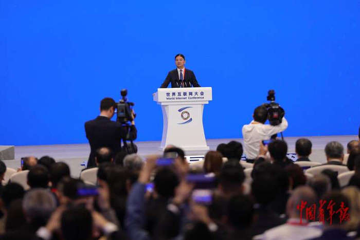 11月7日,浙江乌镇,在2025世界互联网大会乌镇峰会开幕式上。京东集团创始人、京东集团董事局主席刘强东发表演讲。他介绍,在明年4月,京东将建成全球第一个无人配送站。“这是一个源头性的建设,上面几辆无人机,下面全部是无人配送小车,里面是机械臂,对无人机、无人车的货物装载全都是机器人完成。”陈思阳/摄