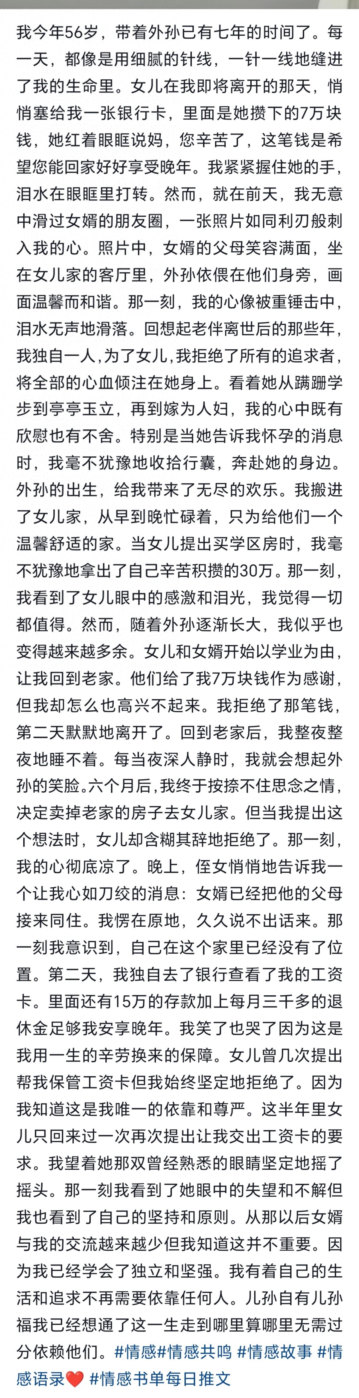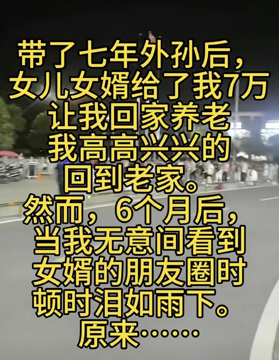 万万没有想到在外孙上一年级的时候,女儿却说感谢你帮我带了几年的孩子,辛苦几年了,现在孩子大了,我们也能自己接送了,不敢再辛苦你了,希望你回老家享几年的清福,等过几年再把你接过来。